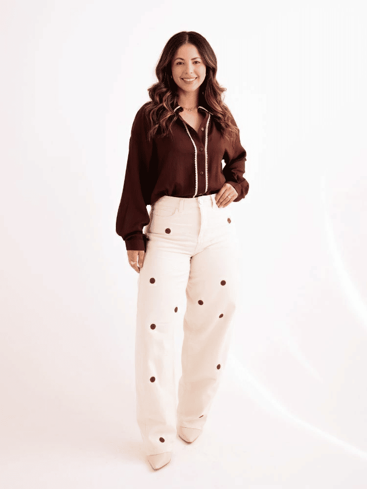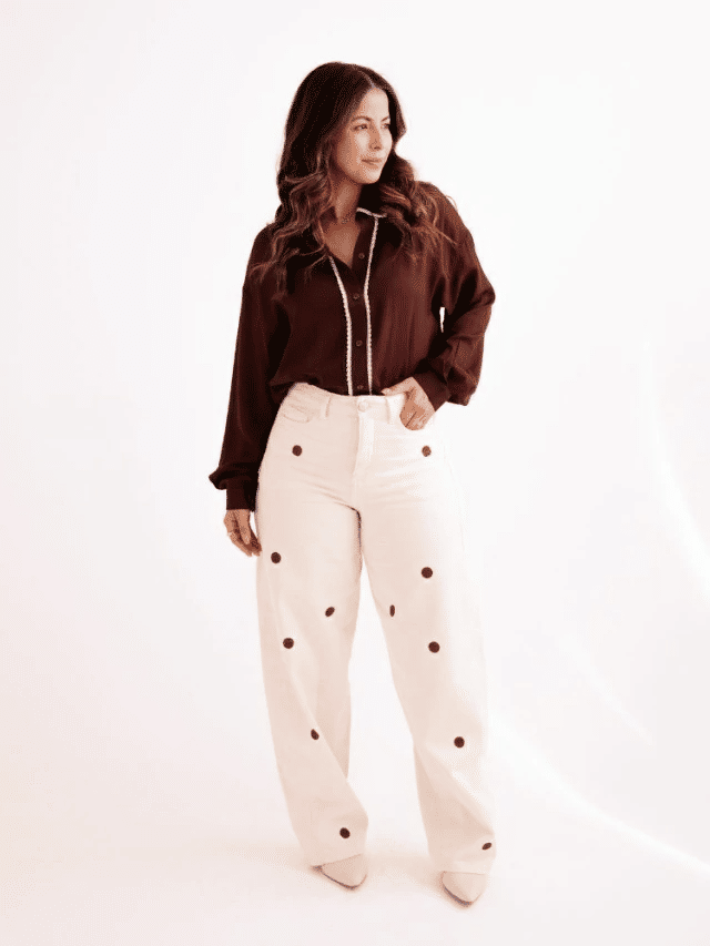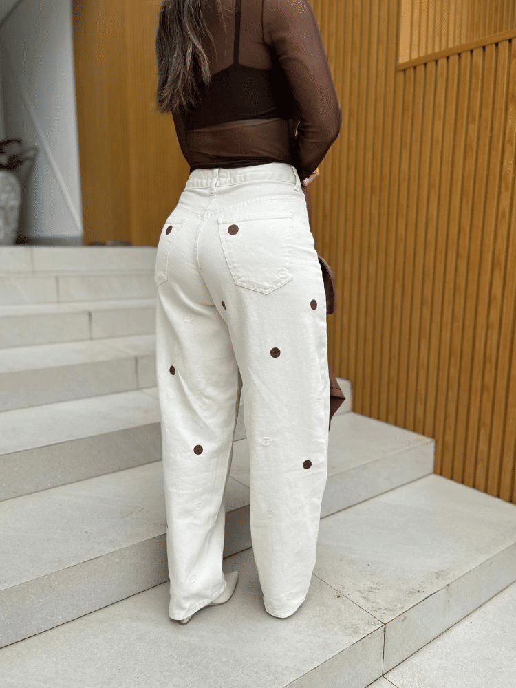 A clássica calça em tom off-white ganha charme extra com os poás bordados em contraste, trazendo um toque divertido e sofisticado ao look. Confeccionada em algodão com caimento estruturado, possui modelagem reta, bolsos funcionais e fechamento por zíper e botão. Versátil, combina tanto com produções casuais de dia a dia quanto com composições modernas para a noite.